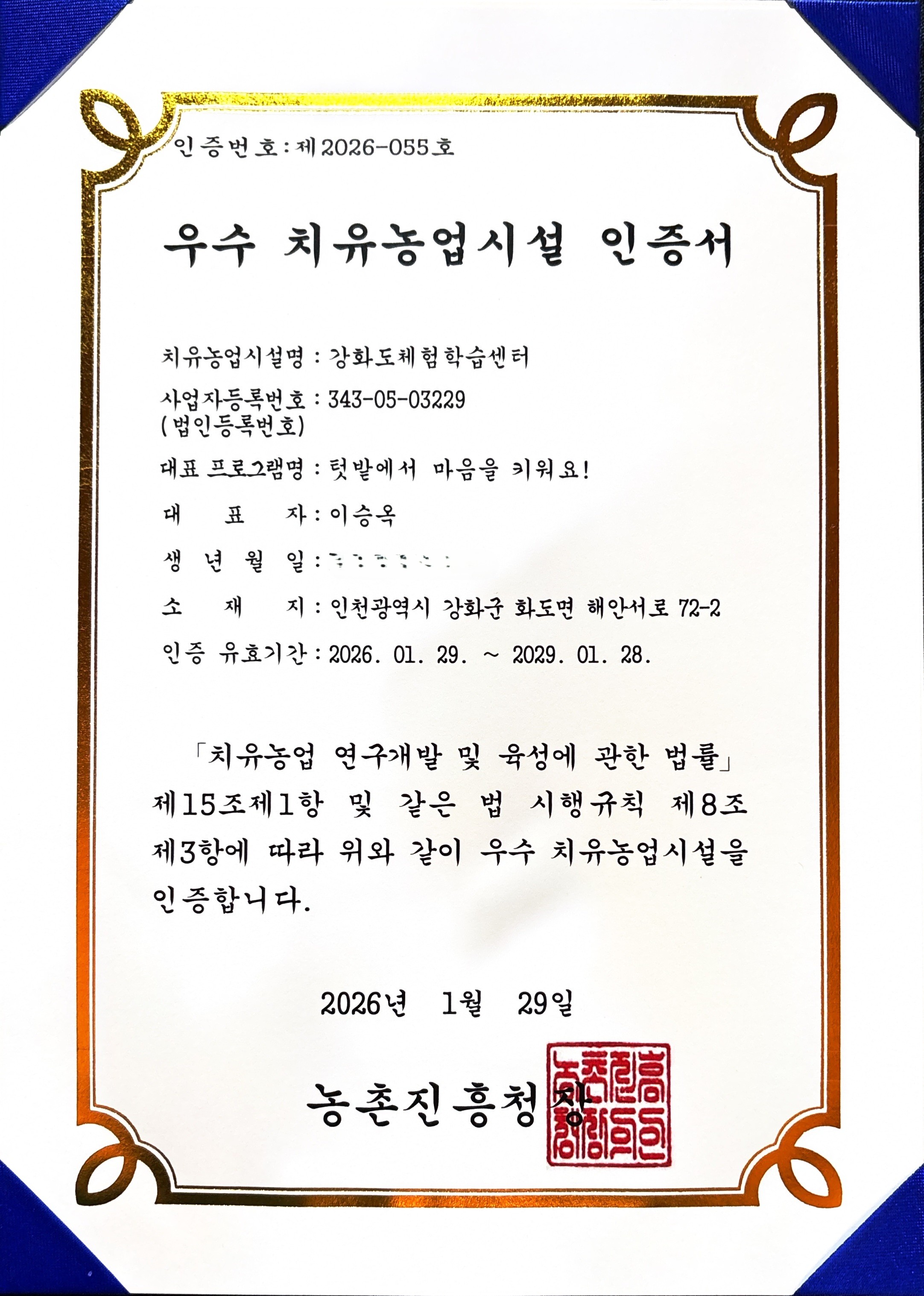 | ³óÃÌÁøÈïû¿¡¼ óÀ½ ½Ç½ÃÇÏ´Â ¿ì¼ö Ä¡À¯³ó¾÷½Ã¼³ ÀÎÁõÀ» ¹Þ°Ô µÇ¾ú½À´Ï´Ù. ÀÎõÁö¿ª¿¡´Â ÀúÈñ°¡ ÃÖÃÊ ÀÎÁõ½Ã¼³ÀÔ´Ï´Ù. ÀÎÁõ½Ã¼³ Á¶°ÇÀÌ »ó´çÈ÷ ¾ö°ÝÇß½À´Ï´Ù.